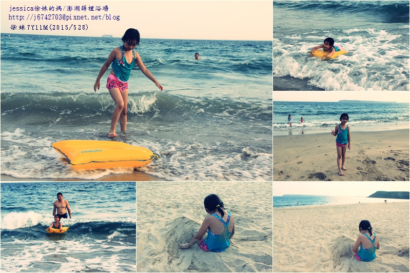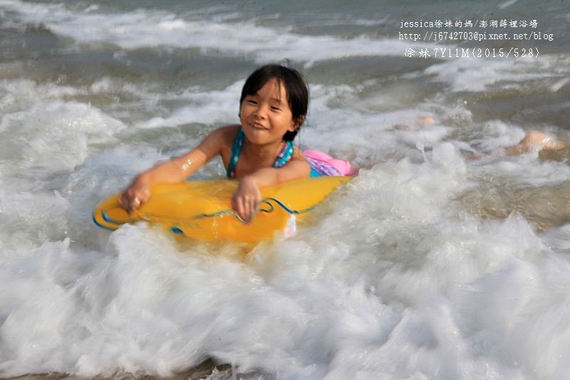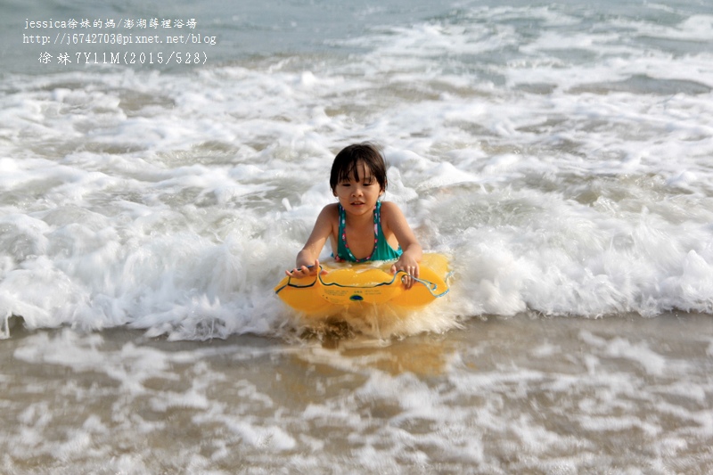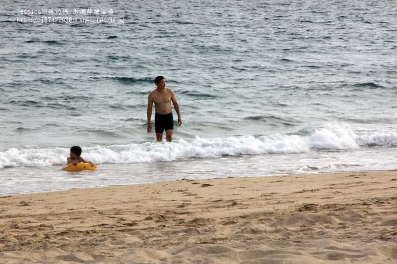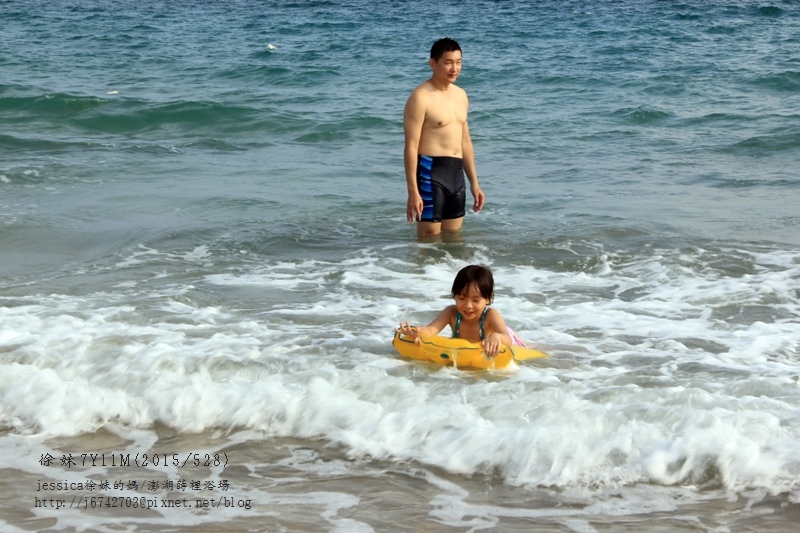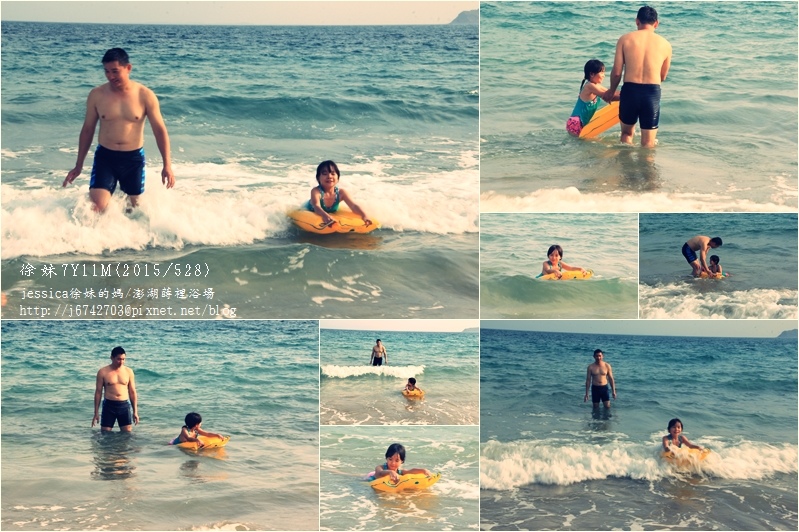 不一會父女倆已投入大海懷抱,是說才剛下水一旁的女孩已搶著要用我們家的充氣式浮板