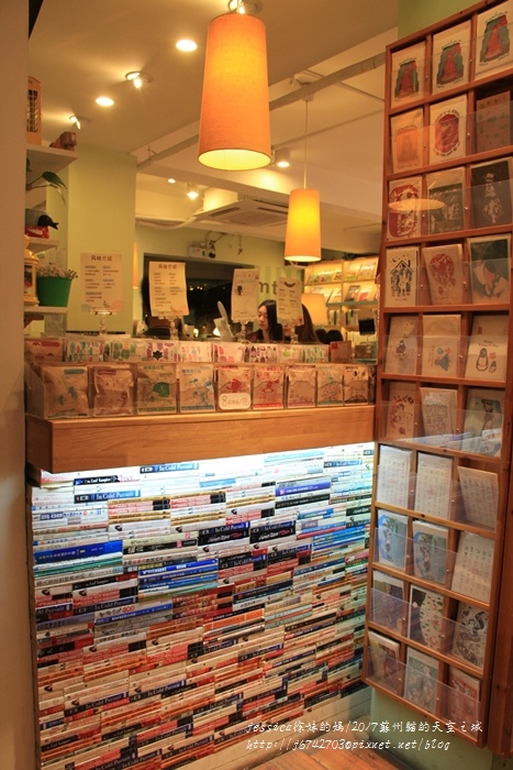 書店裡,賣著書籍 明信片還有雜貨,另外也提供飲品的服務