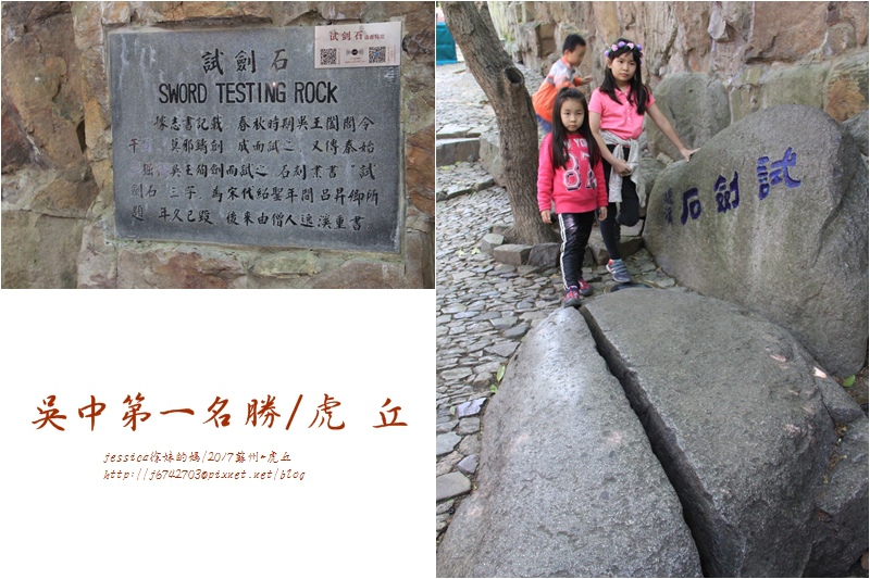 試劍石是位於虎丘山斷梁殿山道左側的一塊圓形巨石,正中有似刀砍劍劈的溝裂。