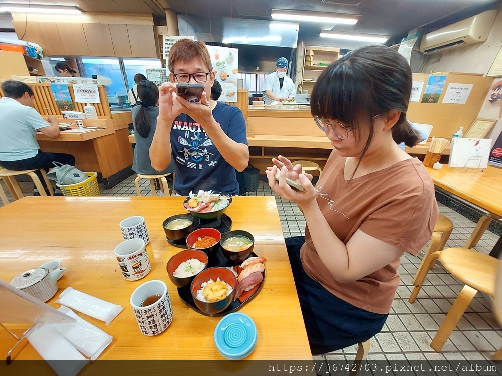 這兩位的海鮮蓋飯先送上來,平時很少相機先食的兩位竟不約而同地拿起手機拍照