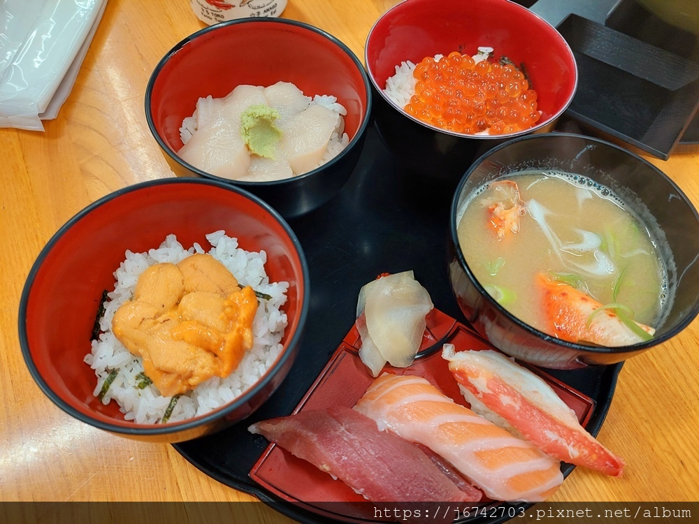 海鮮五膳內容有: 海膽蓋飯 鮭魚卵蓋飯 以及干貝?蓋飯外加鮭魚、鮪魚、蟹肉握壽司